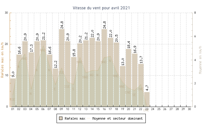 | min | max | moy | Vitesse (rafales) | Secteur | ||